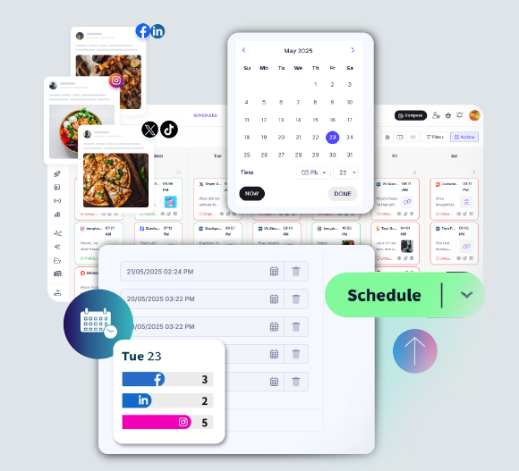 Let AI create, schedule, and publish your content to all social channels automatically. Focus on your business, while our Platform keeps your online presence active 24/7 – even while you sleep.